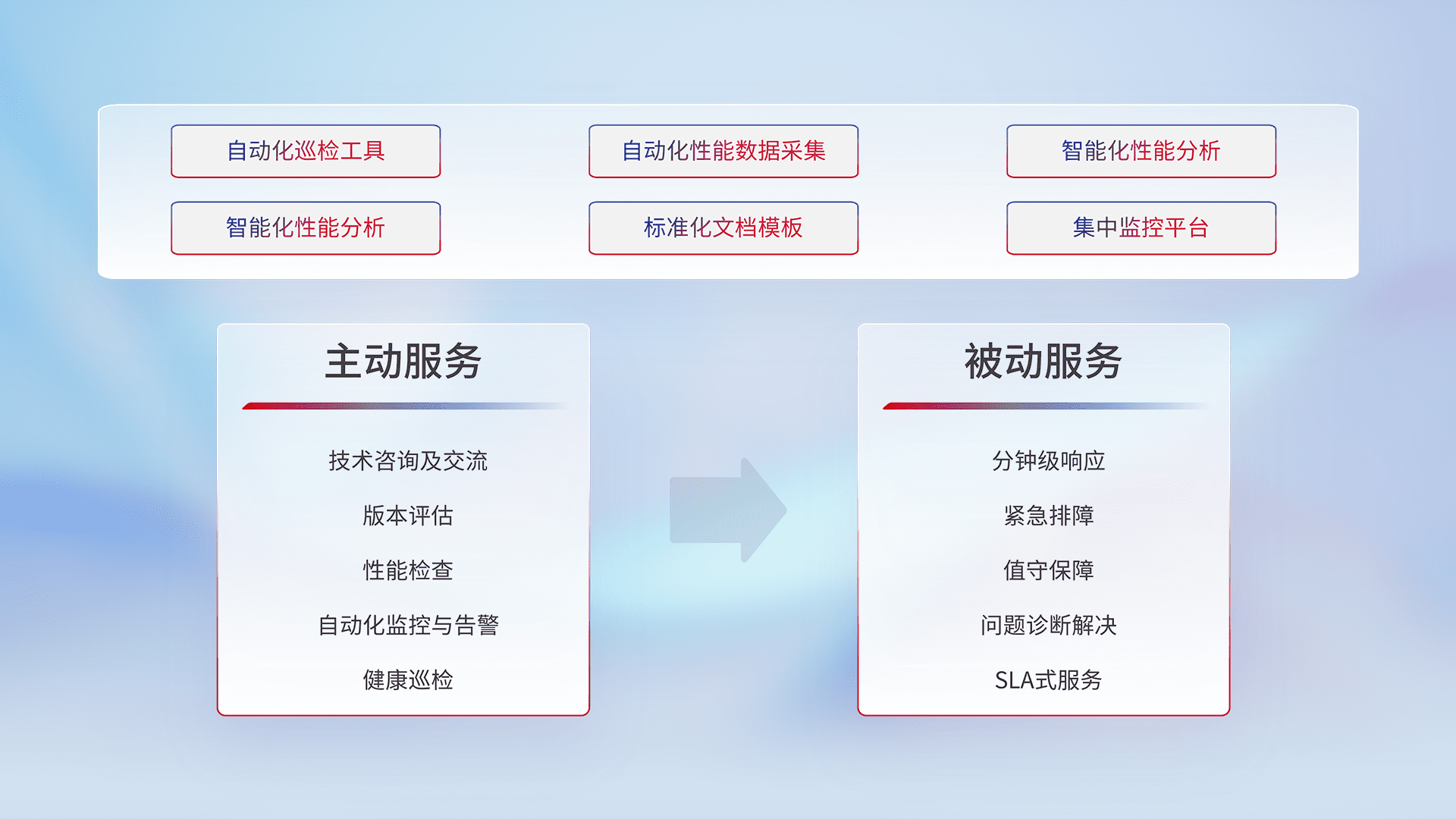 智能化工具和标准化文档,,,保障服务质量,,,,提供主动服务(包含技术咨询、、版本评估、、性能检查、、、自动化监控与告警、、、健康巡检)和被动服务包含(分钟级响应、、、紧急排障、、、值守保障、、问题诊断解决、、、、SLA服务)。。。
